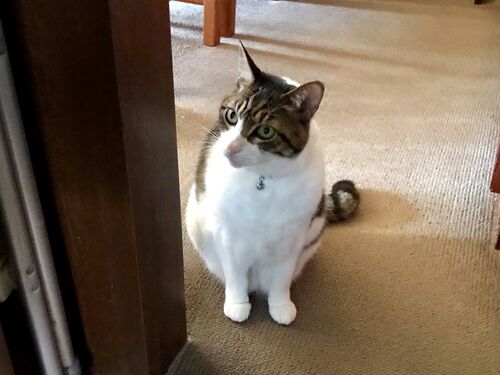 台所に立っていると、気配が・・・ When I'm in the kitchen, I feel someone's gaze. あくまで視線を合わせようとはしない。 He doesn't look at me. ミィ「お腹空いた!!」 Mie:I'm hungry!!